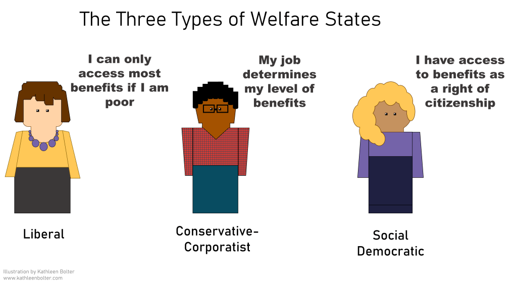 In classical political economy literature, there are three primary types of welfare states: Liberal, conservative-corporatist, and social democratic. The welfare state refers to the different systems adopted by governments to protect the well-being of their citizens. The generosity of welfare state benefits differs between each of the regimes and produces significantly different levels of decommodification.