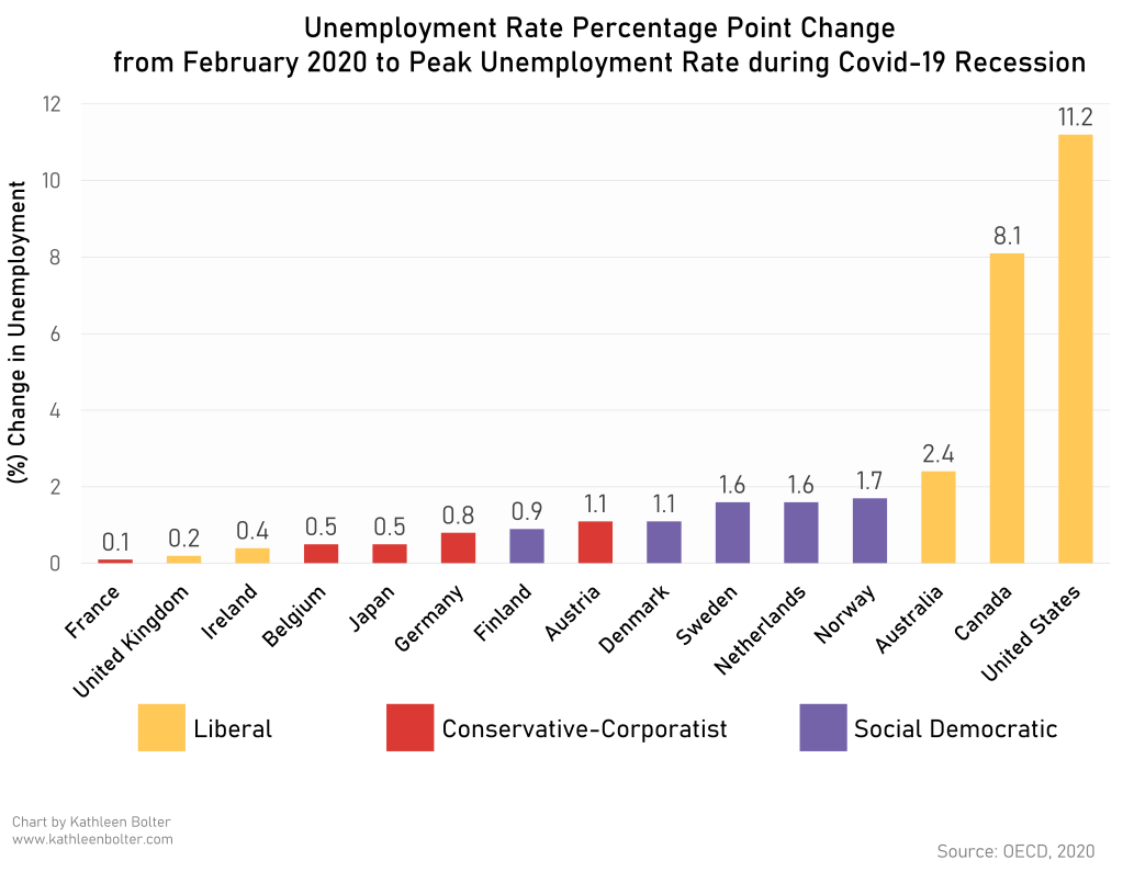 Three different countries, three entirely different experiences for people. As shown in the above chart, the level of decommodification guaranteed by governmental policies heavily impacts how something as disruptive as a job loss is likely to occur in the first place. The majority of the liberal welfare states saw large jumps in unemployment, while the social democratic and conservative-corporatist states saw only minor increases in their unemployment rates. It is worth noting that as the crisis continues, the unemployment rate continues to slowly increase in many conservative-corporatist and social democratic states. While liberal states faced a high initial shock in terms of unemployment, rates in liberal countries have quickly rebounded, although they remain higher than pre-pandemic.