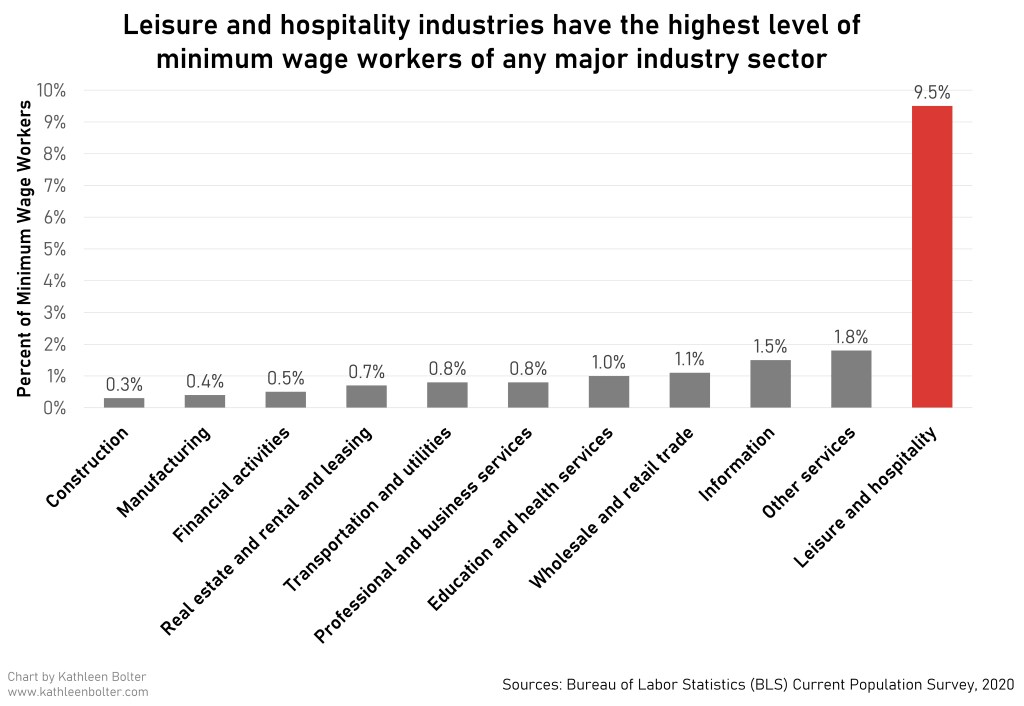 The loss of leisure and hospitality jobs is important because of the outsize impact such job losses have on low wage workers. In 2019, just under 10% of workers in the Leisure and Hospitality Industry earned at or below the federal minimum wage, the most of any major industry sector. The average weekly wage for Leisure and Hospitality workers was $482 in 2019, less than half of the average weekly wage of $1,138 for all industries. Essentially, the loss of leisure and hospitality jobs has disproportionately impacted workers who earned very little to begin with and already faced unstable and precarious working conditions. It is questionable whether, low wage workers will be able to withstand a long-term downturn in their industry without additional aid.